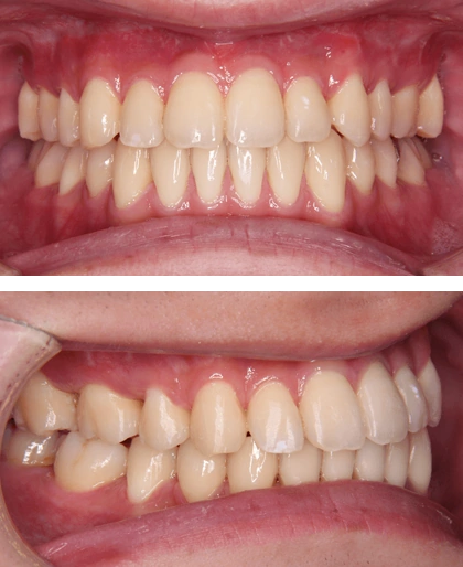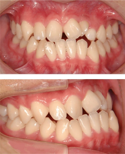 上顎4本の小臼歯を抜歯して、マルチブラケット装置を使用して歯並びを整えた後に下顎骨切り手術で咬み合わせと側貌を治した症例。